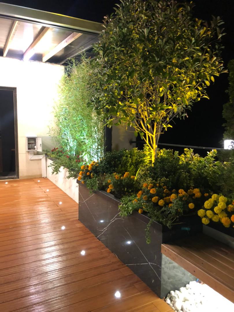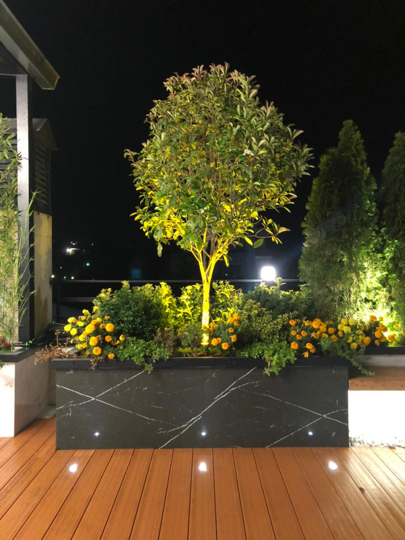 اولین گام در اجرای این پروژه ، آمادهسازی زیرساختها بود. برای گلدانها و کفپوش روف گاردن، آهنکشی انجام شد تا استحکام لازم برای تحمل وزن گلدانها و سایر عناصر تأمین شود. گلدانهای گالوانیزه با ابعاد مشخص در کارگاه ساخته شدند و بهصورت موازی در کنار هم قرار گرفتند. این انتخاب نهتنها دوام بالایی به روف گاردن داد، بلکه به طراحی منظم و شیک آن کمک کرد. پس از اتمام شاسیکشی، گلدانها با سرامیک کاور شدند. فارسیبر کردن لبههای سرامیک، زیبایی بصری پروژه را دوچندان کرد و نشان داد که در اجرای روف گاردن، توجه به جزئیات چقدر اهمیت دارد.