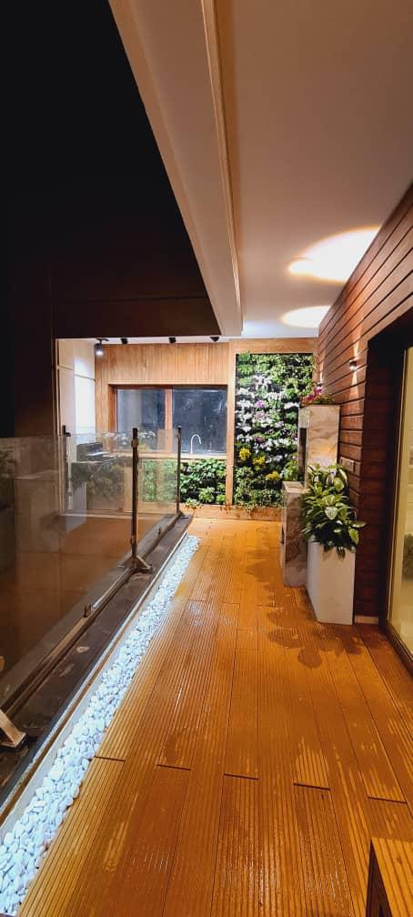 کفپوش این تراس و پوشاندن سنگ کف از چوب پلاست یا وودپلاست استفاده شد که به منظور نصب آن شاسی کشی فلزی به قوطی 30*30 انجام شد.