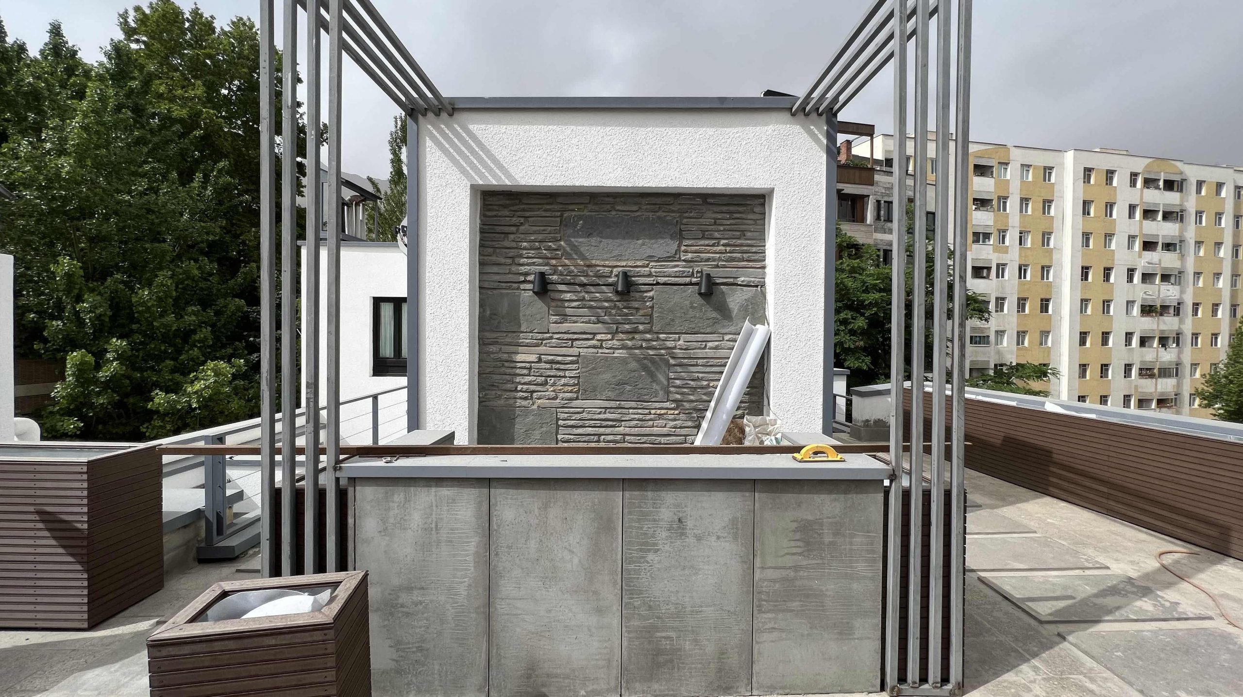 برای پوشش کف روف گاردن، از بتن اکسپوز استفاده شد که هم زیبایی خاصی به فضا میبخشد و هم مقاومت بالایی دارد. همچنین، شاسیکشی فلزی بهعنوان اسکلت اصلی برای نصب گلدانها و سایر سازهها اجرا شد. این ساختار محکم، پایداری روف گاردن را در برابر باد و شرایط جوی تضمین میکند.