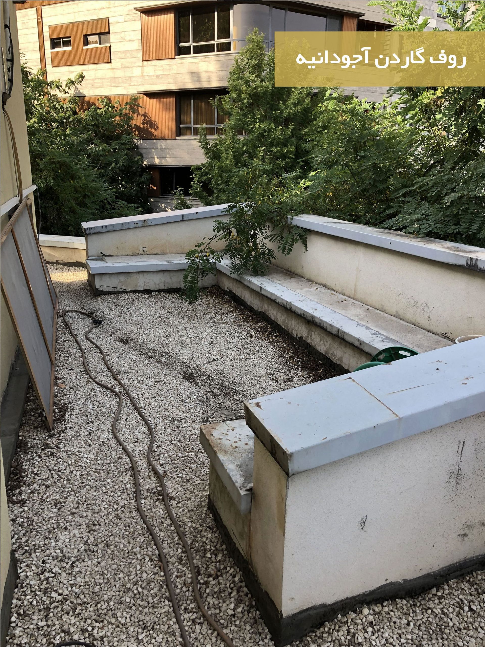 اولین گام در اجرای روف گاردن آجودانیه، برداشتن عایق قدیمی کف بود. این مرحله برای اطمینان از حذف هرگونه نقص یا آسیب در عایقبندی قبلی انجام شد. پس از آن، عایقبندی مجدد با استفاده از قیر و ایزوگام صورت گرفت. این روش یکی از مطمئنترین راهها برای جلوگیری از نفوذ آب به سازه زیرین است که در روف گاردنها از اهمیت ویژهای برخوردار است. عایقبندی دقیق و اصولی، پایهای محکم برای سایر مراحل اجرایی روف گاردن فراهم کرد و تضمینکننده دوام طولانیمدت پروژه بود.