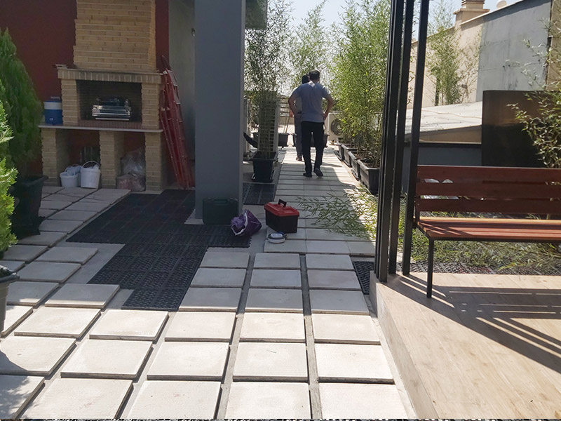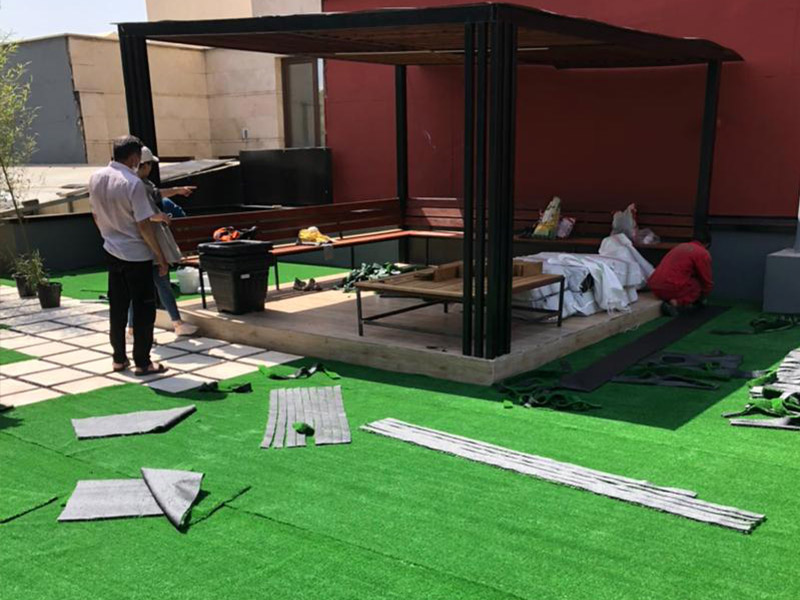 چمن مصنوعی یکی از بهترین گزینهها برای پوشش کف در طراحی و اجرای روف گاردن است. در این پروژه از چمن مصنوعی دو بافت استفاده شد که علاوه بر ایجاد حس طبیعی، از نظر نگهداری نیز بسیار کمهزینه است. چمن مصنوعی امکان ایجاد یک محیط راحت برای استراحت و بازی کودکان را فراهم میکند و در عین حال، مقاوم در برابر شرایط جوی مختلف است. همچنین، ترکیب چمن مصنوعی با گلدانهای متنوع باعث افزایش زیبایی بصری محیط شده است.